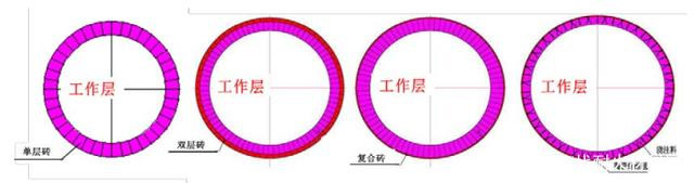 回轉(zhuǎn)窯焚燒爐非常關(guān)鍵設(shè)備即為回轉(zhuǎn)窯本體, 因其是一種動態(tài)運(yùn)轉(zhuǎn)設(shè)備,對內(nèi)襯結(jié)構(gòu)設(shè)計(jì)要求較高,首先要確保耐火內(nèi)襯在動態(tài)高溫狀態(tài)運(yùn)行下整體內(nèi)襯的穩(wěn)定性,防止耐火磚掉磚、抽簽等問題。對于危廢回轉(zhuǎn)窯系統(tǒng)而言,由于轉(zhuǎn)速比較慢,一般在1轉(zhuǎn)/分以下,可以根據(jù)廠房設(shè)計(jì)和節(jié)能要求選擇單層磚、雙層磚、復(fù)合磚和整體澆注等不同結(jié)構(gòu), 如圖3所示。回轉(zhuǎn)窯耐火材料總厚度一般是250~300mm不等,其中工作層耐火磚材質(zhì)一般根據(jù)處理溫度和危廢種類不同,可以選擇高鋁質(zhì)、剛玉莫來石質(zhì)以及鉻鋯剛玉質(zhì)耐火材料等。