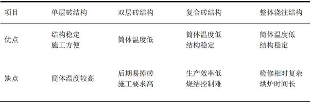 以上幾種設(shè)計(jì)方案優(yōu)缺點(diǎn)如表1所示。相比較而言, 耐火磚方案檢修和更換方便, 受環(huán)境和人為因素影響較小。現(xiàn)在新建項(xiàng)目回轉(zhuǎn)窯基本都是室外設(shè)計(jì), 隨著提產(chǎn)和環(huán)保要求,采用單層結(jié)構(gòu)穩(wěn)定性較好, 高溫區(qū)可以考慮凹槽復(fù)合磚方式,降低外壁溫度。而且從防腐蝕角度, 筒體外壁溫度控制在160~320℃區(qū)間,比較合理。